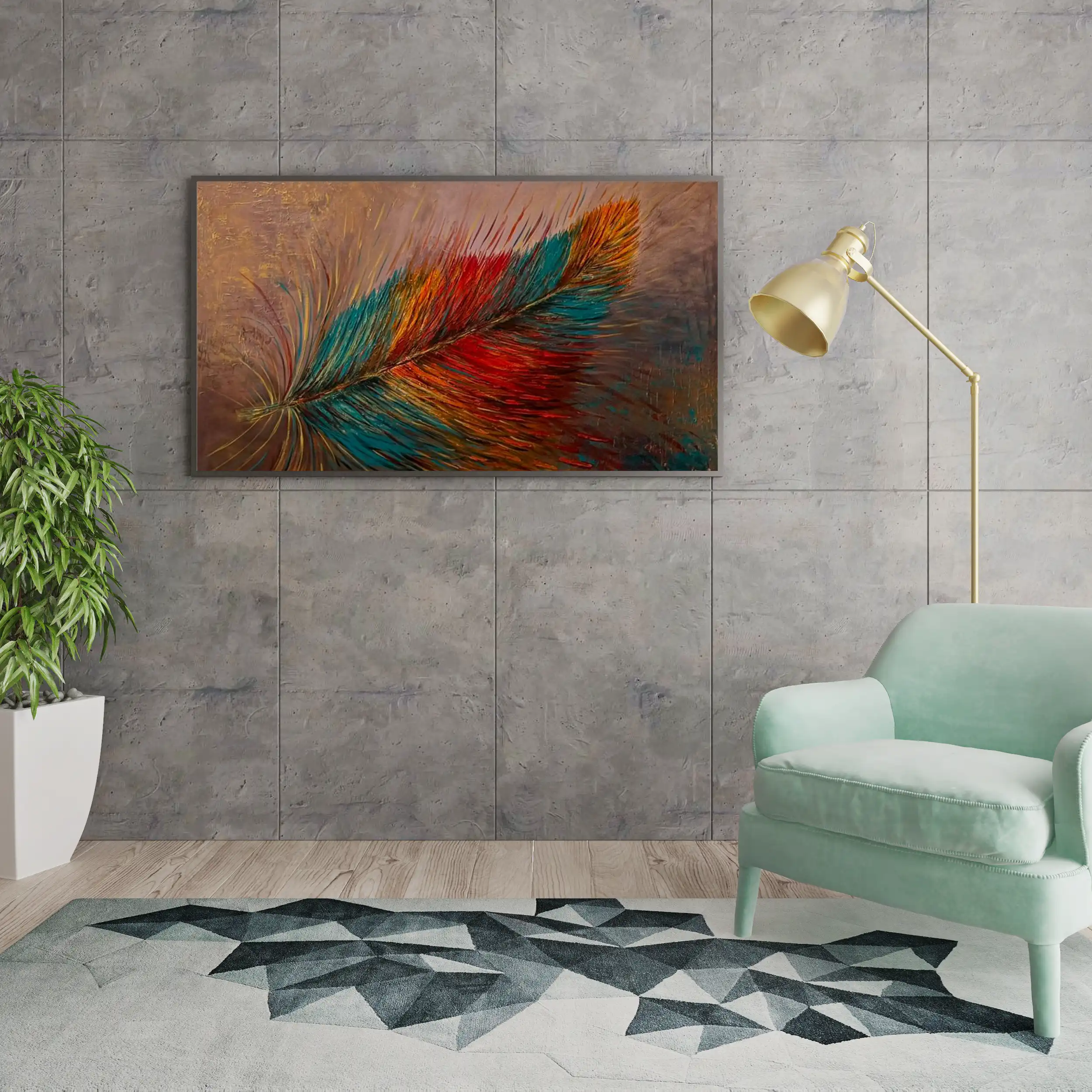 تتميز بتدرجات لونية نابضة تجمع بين الأحمر والبرتقالي والتركواز، في تكوين يشبه انسياب ريشة تتناثر حولها الحركة والضوء. يمنح العمل إحساسًا بالحيوية والهدوء في آن واحد، ويُعد إضافة أنيقة تُناسب غرفة الجلوس أو المكتب أو غرفة النوم.
