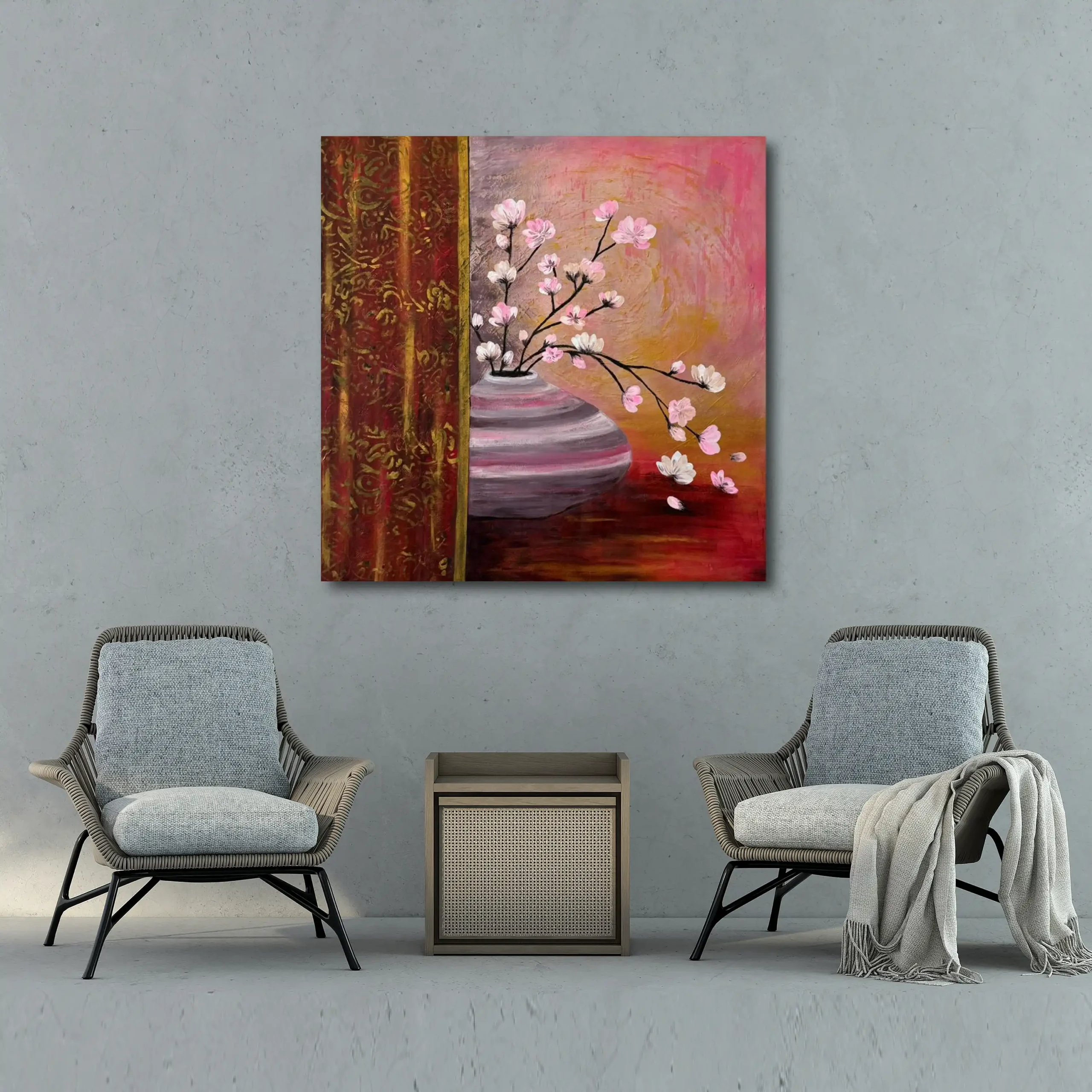 تتميز بتصميمٍ هادئ يجمع بين مزهرية أنيقة تتفتح منها زهور ناعمة بلون وردي رقيق، وخلفية دافئة تمزج بين درجات الوردي والذهبي بطريقة تمنح إحساسًا بالانسجام والرقي. يضفي الستار المزخرف على الجانب لمسة كلاسيكية تزيد من جمال التكوين، مما يجعل اللوحة قطعة مثالية لإضافة لمسة راقية لأي مساحة داخلية.